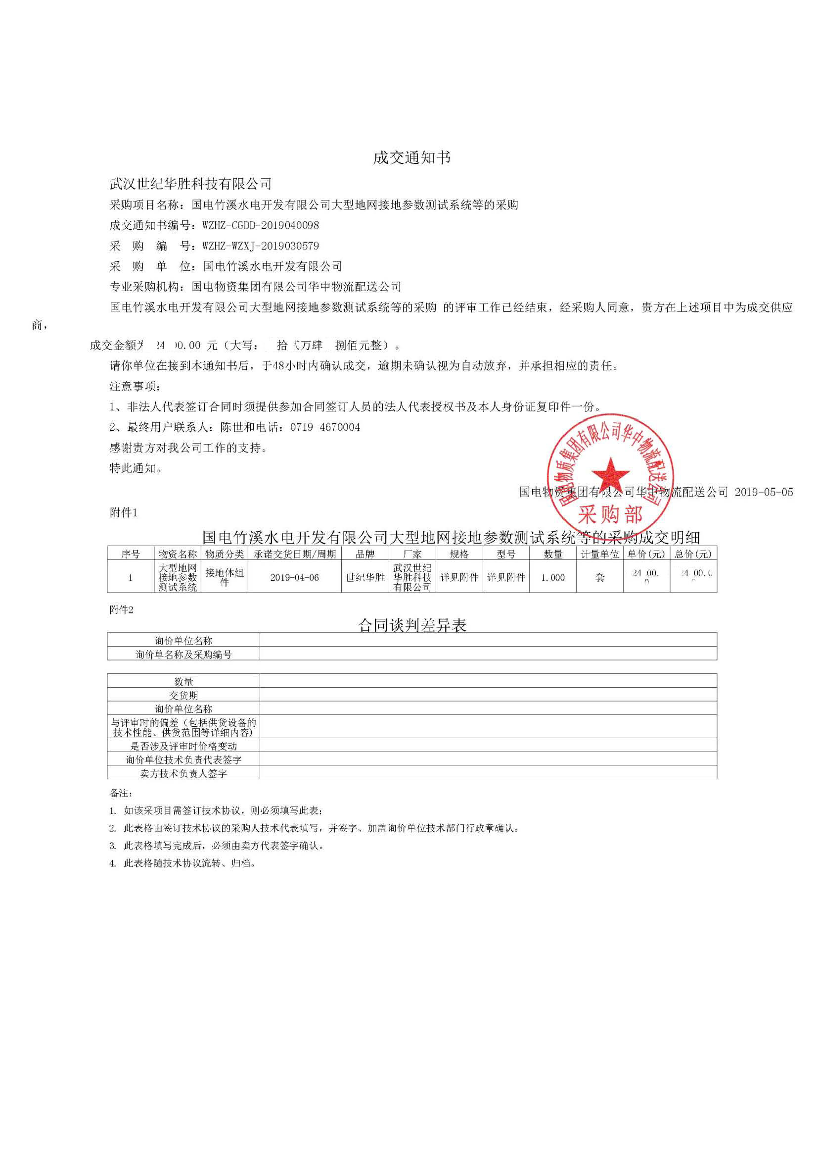 ? ? 武漢華勝公司電子商務部經(jīng)過大家的不斷努力,最終拿下“國電竹溪水電開發(fā)有限公司大型地網(wǎng)接地參數(shù)測試系統(tǒng)等的采購”項目。