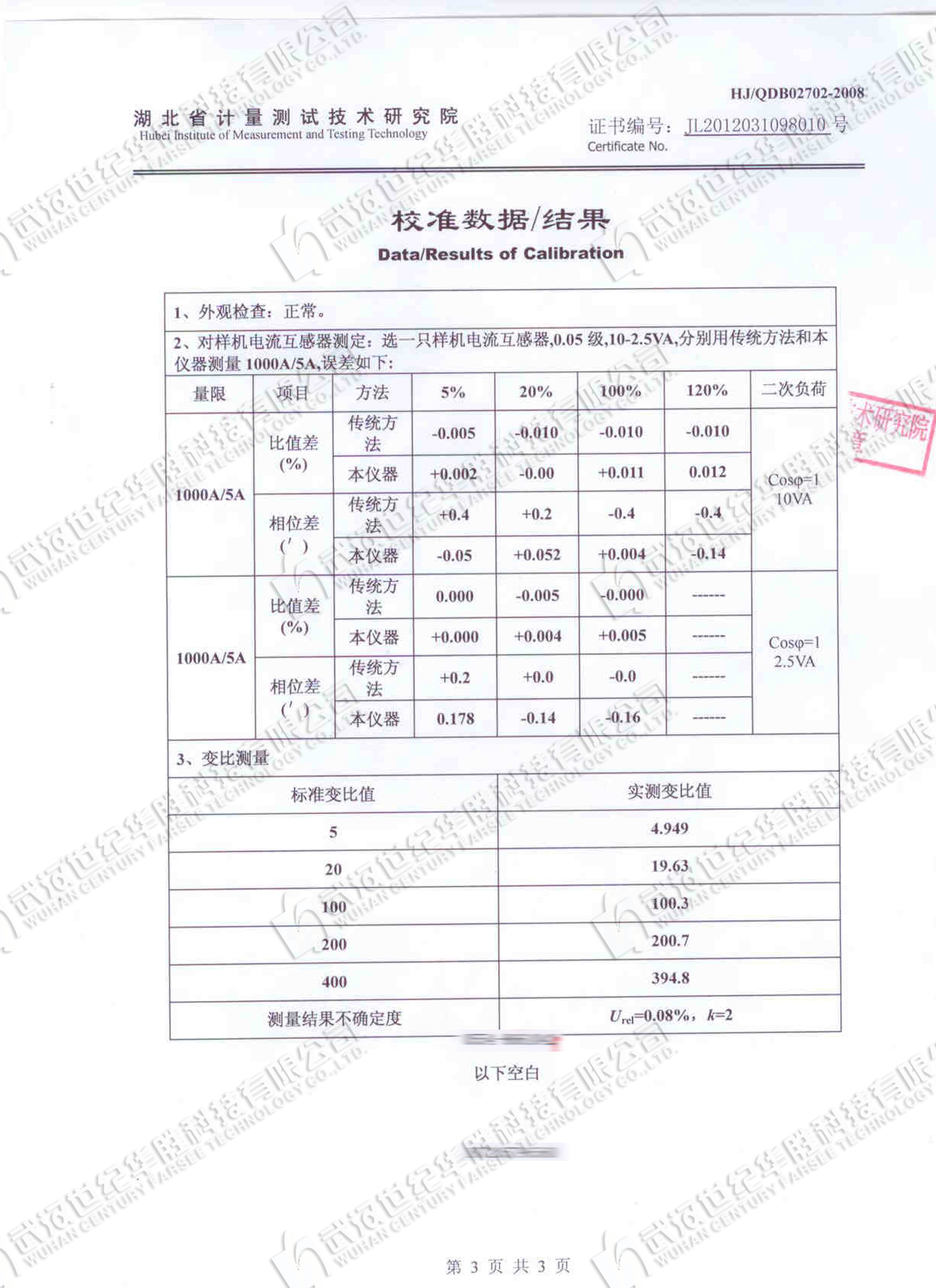 注:二次電流為1A的電流互感器,通過等安匝測(cè)量方法變比可至31500A/1A。